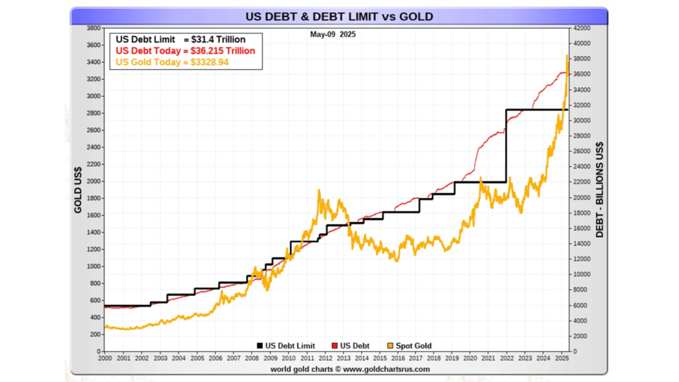 As US debt climbs (the red line), over the longer term, the gold price (the gold price) tends to follow (gold prices go up and down – debt only seems to go up!)