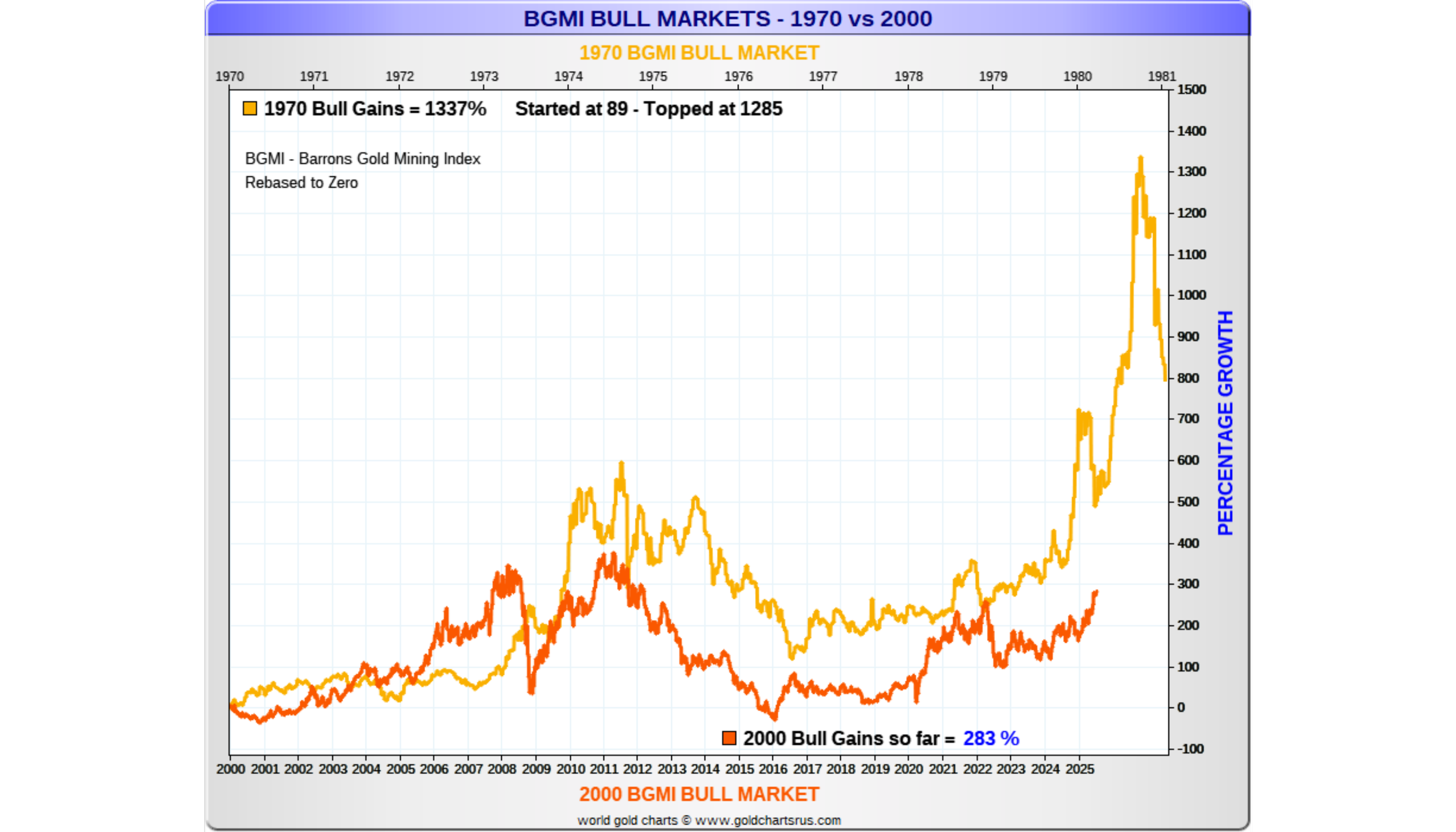 It compares the Barrons Gold Mining Index in the 1970’s (the gold line) with the current one (the red line).